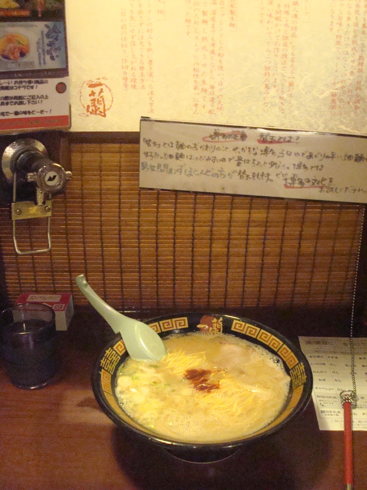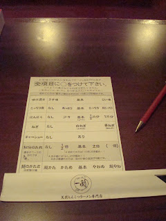 枱面還有張”考試卷”,其真是一張表,是告訴煮店員你要濃湯、清湯、多麵、少麵、多蔥、少蔥、多肉、少肉…..之類的要求。不懂日文,可以叫店員給你英文的表格。