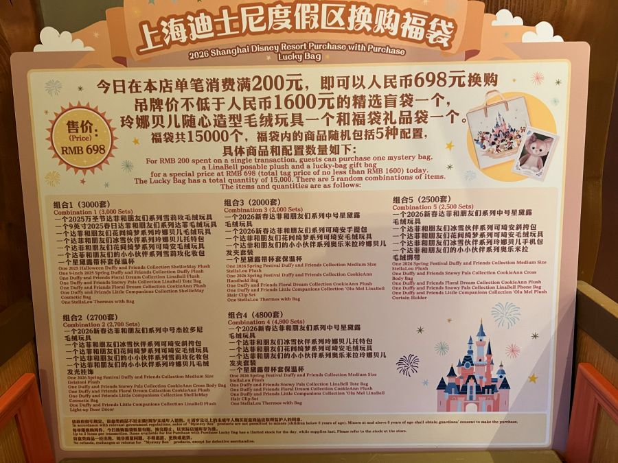 期間,見到很多人拿著個很大的迪士尼帆布袋,還見到有人買了很多個,放在門外讓人守著。後來發現原來是福袋,這福袋必有一個BELL娃娃,福袋內容詳情如下: